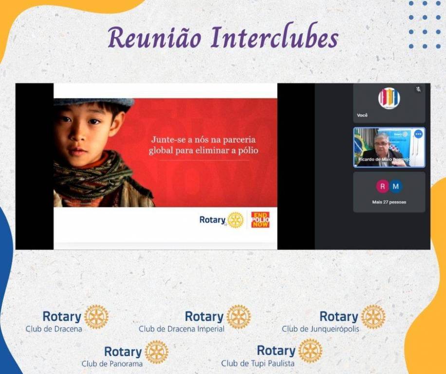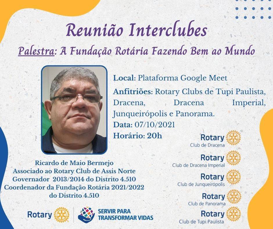 Na quinta-feira, 07/10, os Rotary Clubs de Tupi Paulista, Dracena, Dracena Imperial, Junqueirópolis e Panorama realizaram reunião interclubes que contou com palestra com o tema A Fundação Rotária Fazendo Bem ao Mundo, ministrada pelo Governador do Distrito 4510, Ano Rotário 2013-2014, e Coordenador Distrital da Fundação Rotária, Ano Rotário 2021-2022, Ricardo de Maio Bermejo.