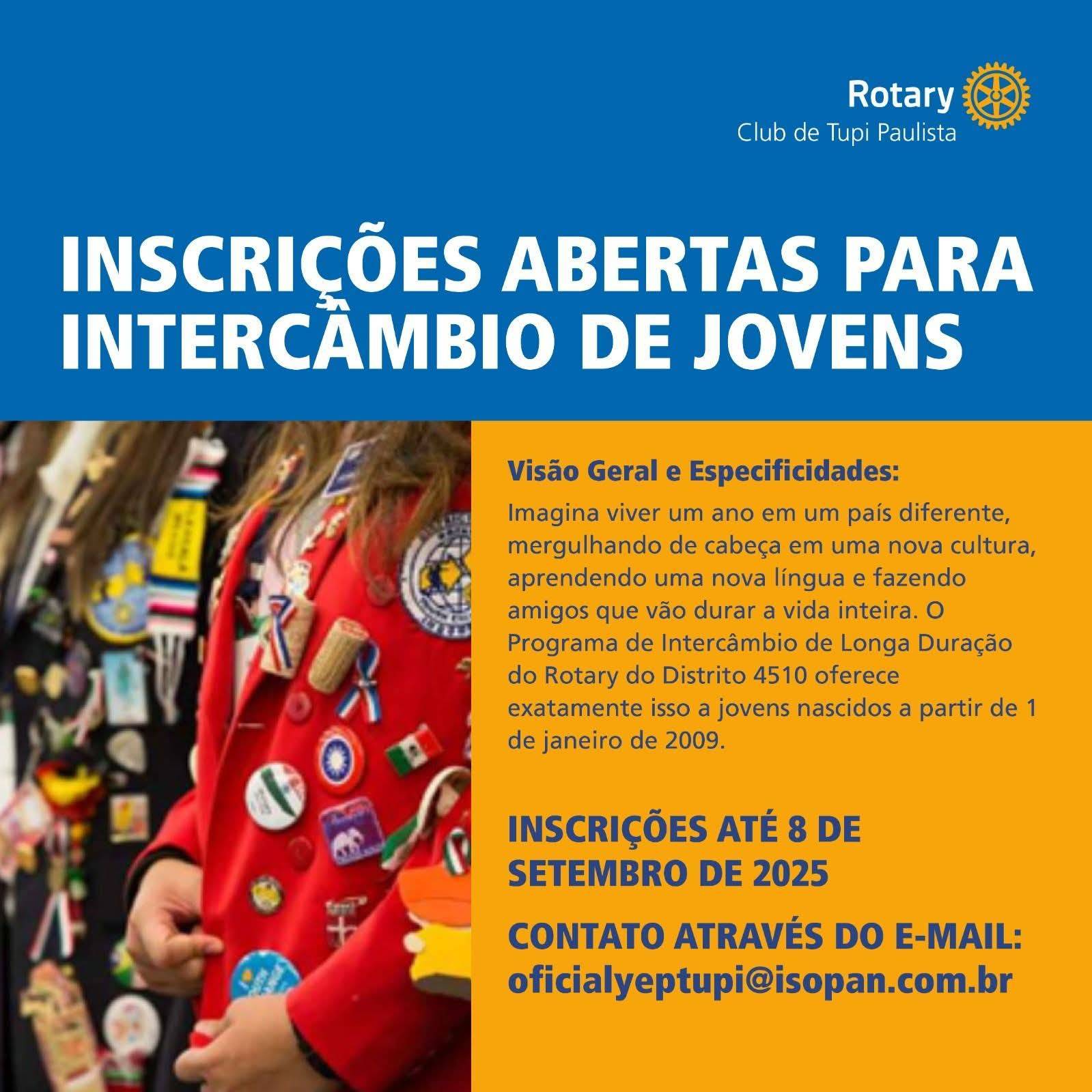 O Distrito 4510 está com inscrições abertas para o processo seletivo 2026-27. O Programa de Intercâmbio do Rotary é uma ferramenta de promoção da paz, através dele os estudantes aprendem uma nova língua, conhecem outra cultura e moram com famílias anfitriãs por todo o ano letivo. Se você nasceu em 2009 e já concluiu o 9° ano do ensino fundamental essa oportunidade é para você. Torne-se um cidadão do mundo, começando sua jornada em um dos 100 países participantes do programa. Contate-nos através do e-mail: [email protected]