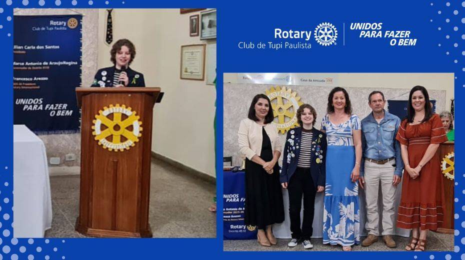 Durante a primeira reunião ordinária do clube, marcando a retomada do Programa de Intercâmbio de Jovens, tivemos a despedida da intercambista Julia, filha do companheiro Mauricio e da integrante da Casa da Amizade, Roseli. Julia embarcou no dia 18 de agosto para Casper, Estado de Wyoming nos EUA, onde será anfitrionada pelo Rotary Club de Casper no Distrito 5440 de Rotary International e ficará lá até junho de 2026. A intercambista levou consigo algumas flâmulas do Rotary Club de Tupi Paulista para presentear os clubes que visitar ao longo do seu intercâmbio, deixando uma lembrança tupiense nos EUA. Desejamos que Julia tenha um ótimo período de intercâmbio, que aproveite essa incrível oportunidade de crescimento pessoal e a experiência de ser uma cidadã do mundo.