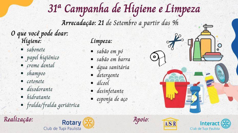 No próximo dia 21 o Rotary Club de Tupi Paulista realizará 31ª edição da Campanha de arrecadação de produtos de higiene e limpeza. Serão atendidas 5 instituições (APAE, Asilo, Santa Casa, GAPO e Serviço Social Paroquial), todo o material arrecada será separado, contabilizado e dividido entre elas. Mais uma vez contamos com a solidariedade da comunidade tupiense nesta campanha que sempre tem sido sucesso e tanto tem ajudado à essas instituições e as pessoas por elas atendidas.